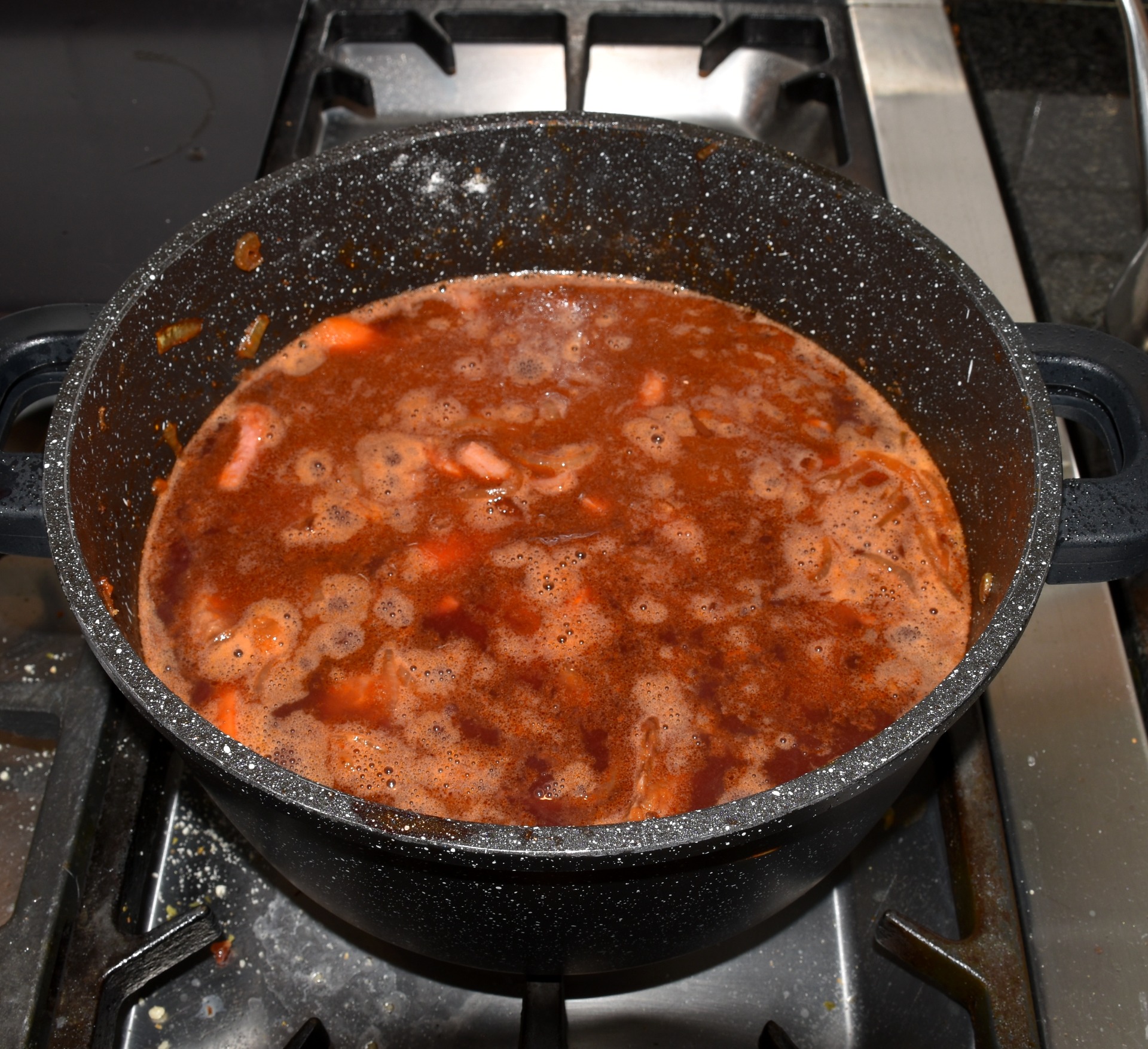 Couvrez la cocotte et laissez mijoter pendant 4 heures à feu très doux, en remuant de temps en temps.