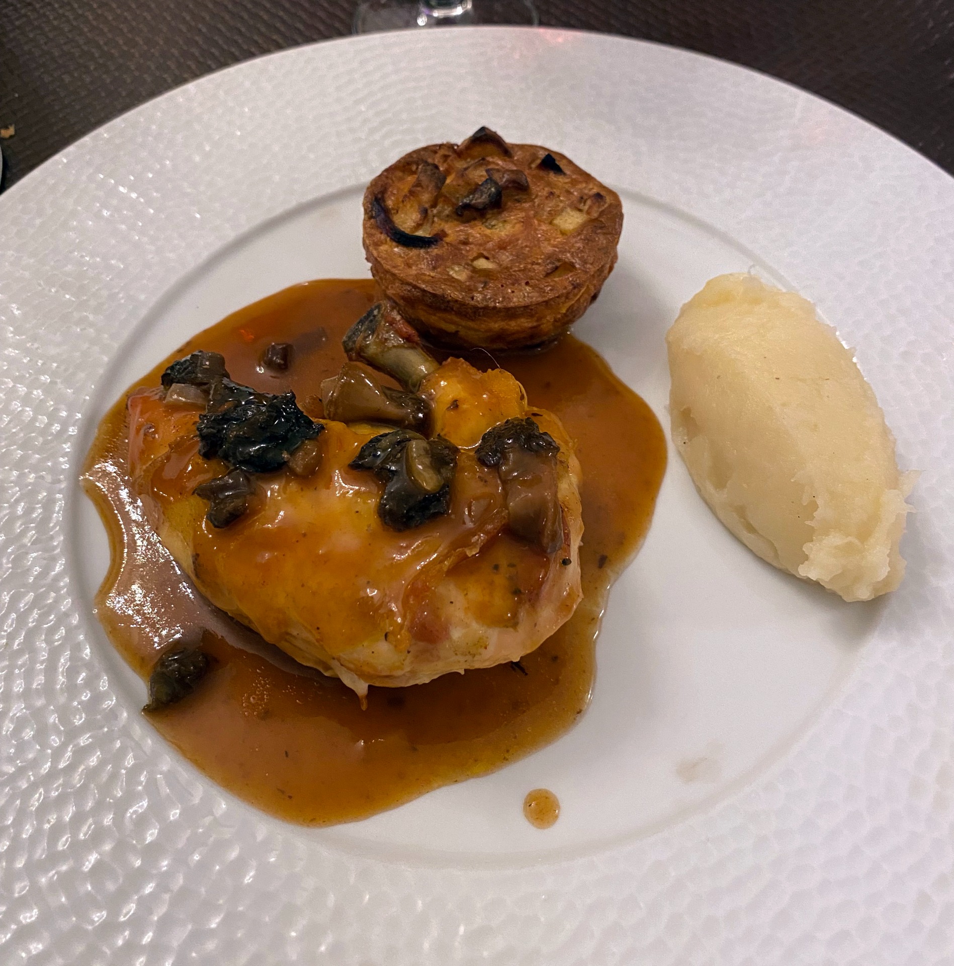 suprème de poulet jaune aux morilles, soufflé pomme de terre et légume du moment