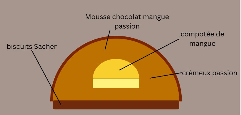 330 grammes de crème (pour la chantilly), 30 grammes de jus de fruits de la passion - 90 grammes de purée de mangue - 90 grammes de crème - 15 grammes de sucre - 15 gramme de beurre de cacao (mycryo) - 2 feuilles de gélatine - 170 grammes de chocolat noir - 15 grammes de beurre