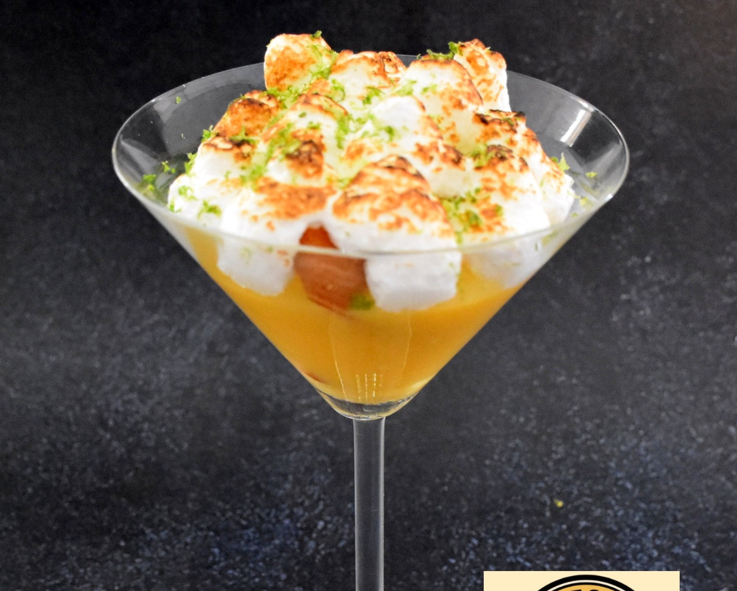 Caramélisez à l'aide d'un chalumeau et décorez avec des zestes de citron vert.