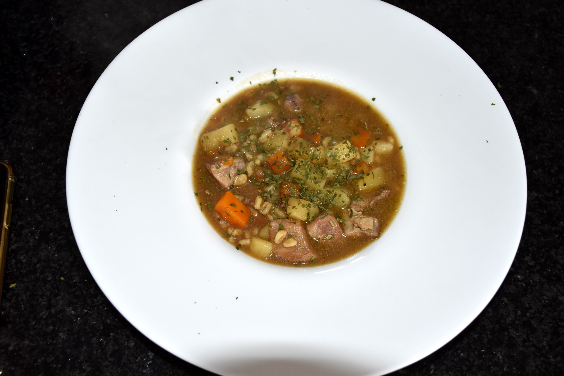 1 KG de collier d'agneau - 1 pinte de GUINNESS (ou bière brune) - 600 grammes de pommes de terre - un peu d'huile - un peu de beurre - 20 grammes de farine - 6 carottes - 300 grammes d'oignons - 2 gousses d'ail - 3 feuilles de laurier - 1 cube de bouillon de légumes - 125 grammes de blé (Ebly) persil - thym - sel - poivre - eau