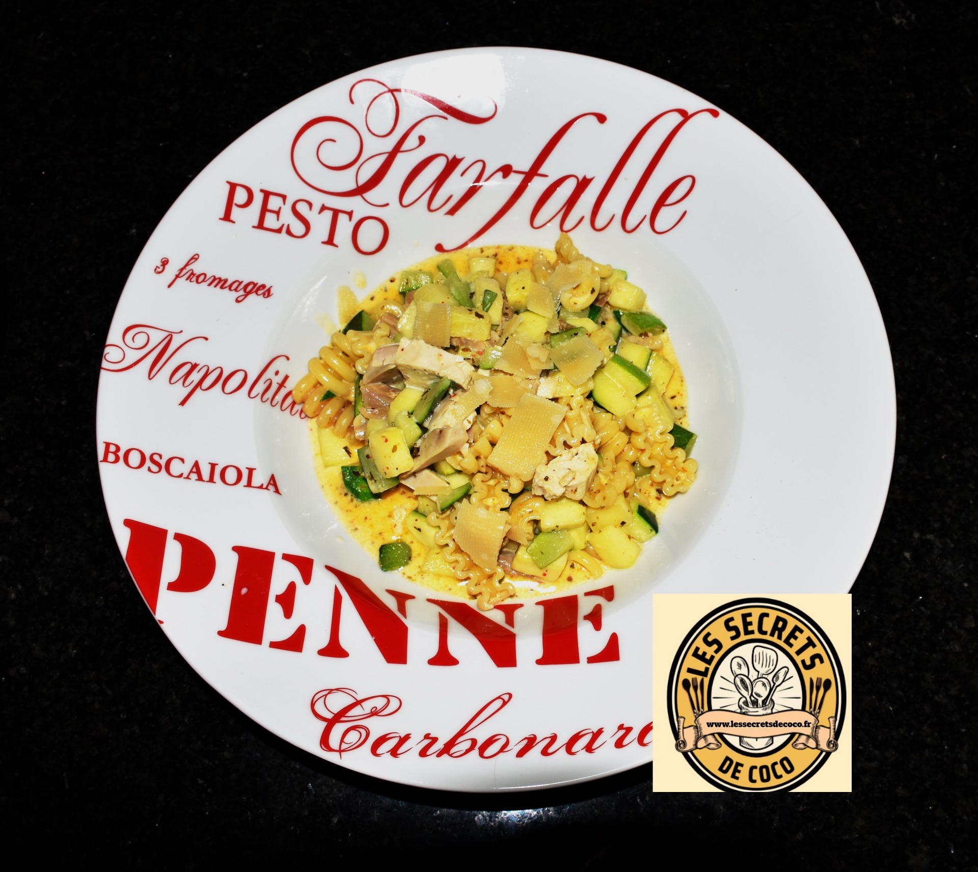 Un reste de pâtes - un reste de poulet rôti - 1 gousse d'ail - 1/2 oignon - 1 courgette - 10 cl de crème fraiche - sel - poivre - piment d'Espelette (facultatif) quelques copeaux de parmesan