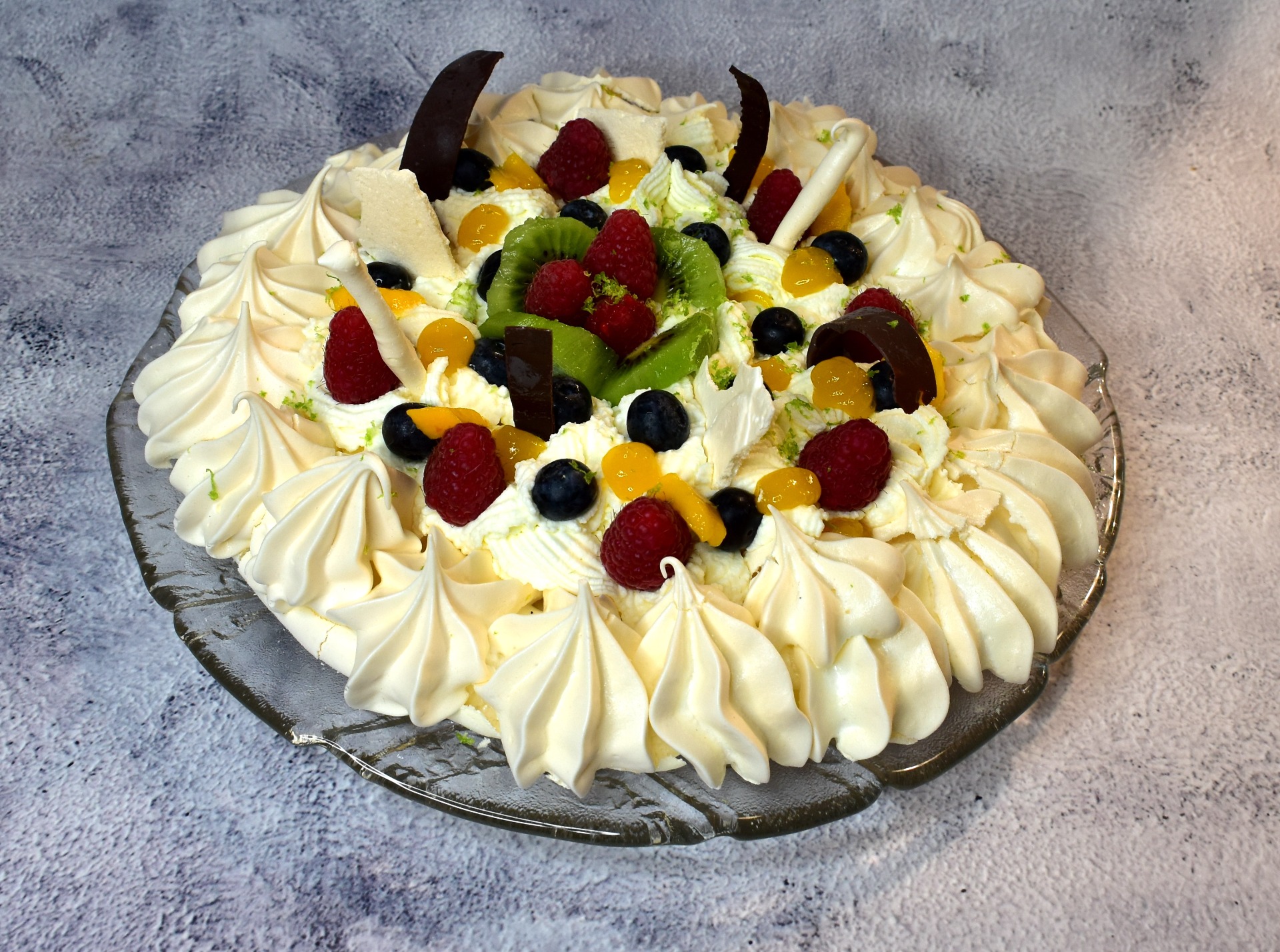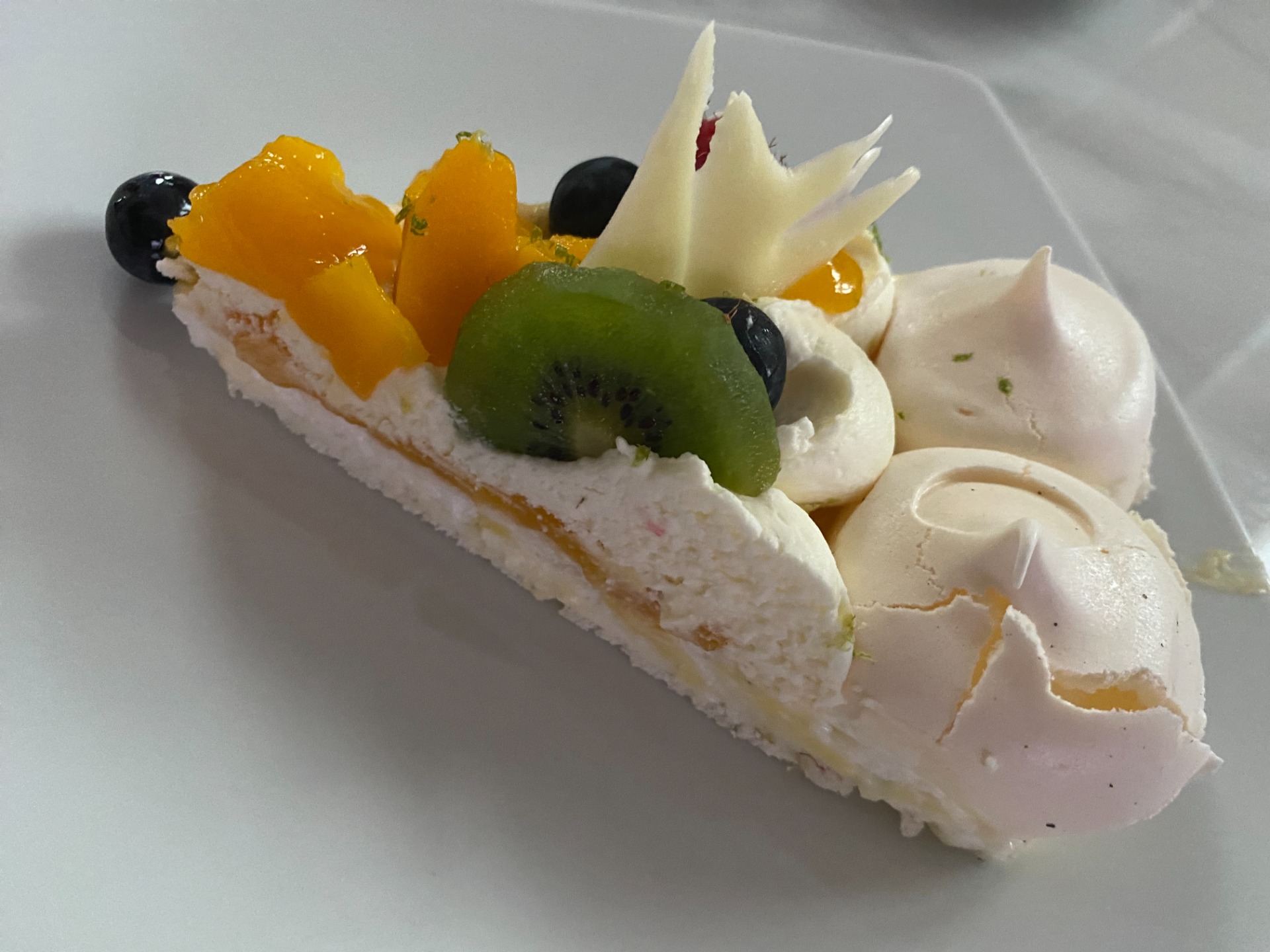 Pochez une fine couche de confit de fruit puis la crème sur la meringue refroidie et décorez avec des fruits, quelques points de confits, du zeste de citron vert, ou toute autre garniture de votre choix.