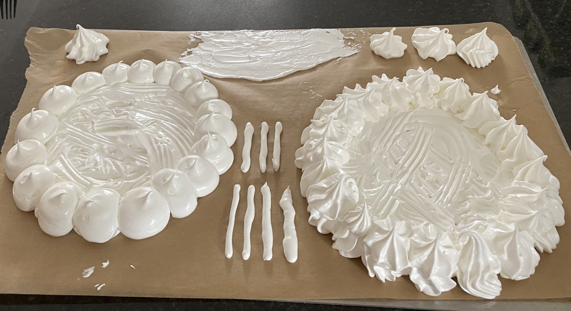 Étalez la meringue sur une plaque d'environ 22/24 cm à l'aide d'une poche à douille, en créant un décor harmonieux avec un creux au centre.