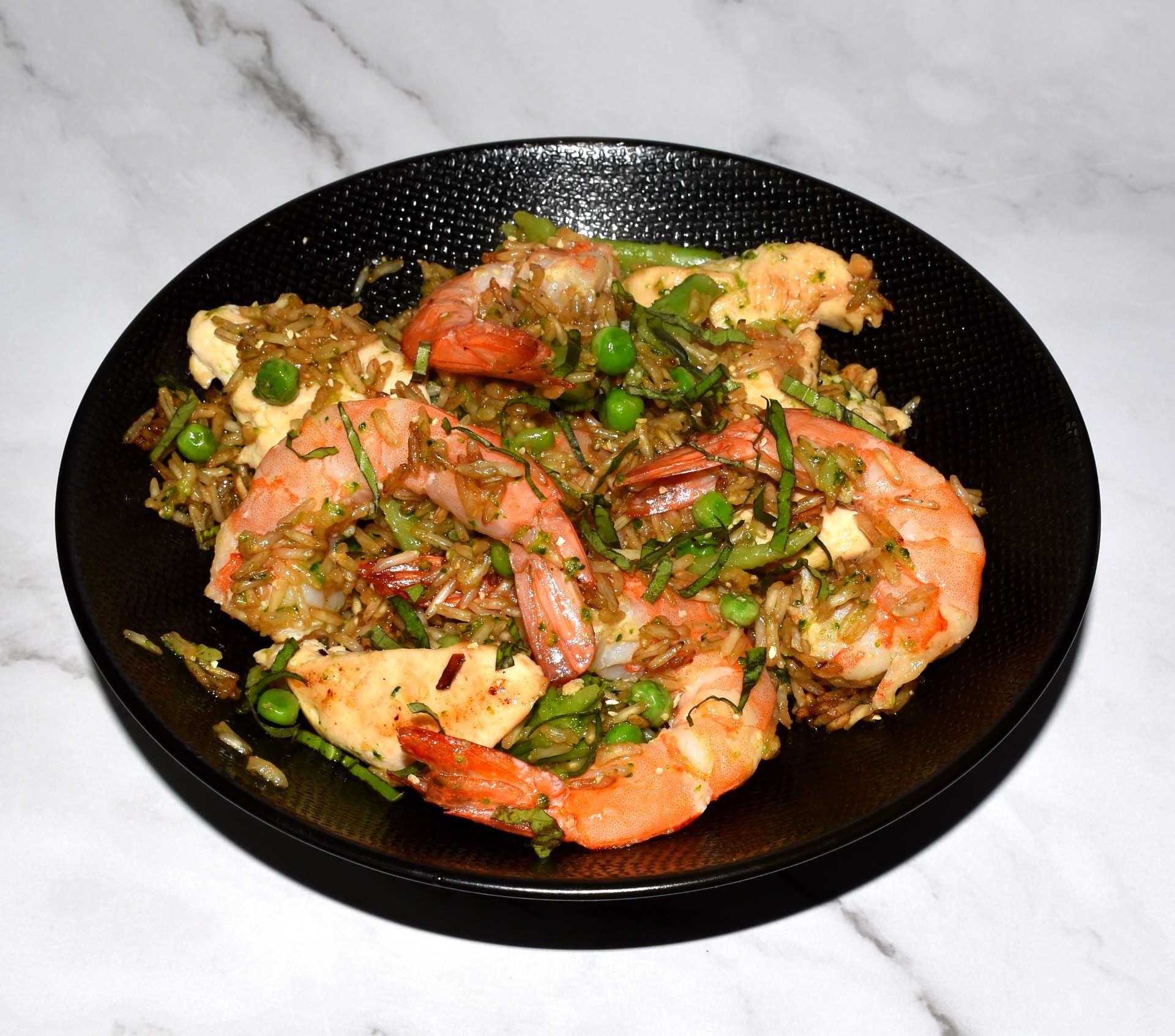 Riz sauté aux gambas et au poulet