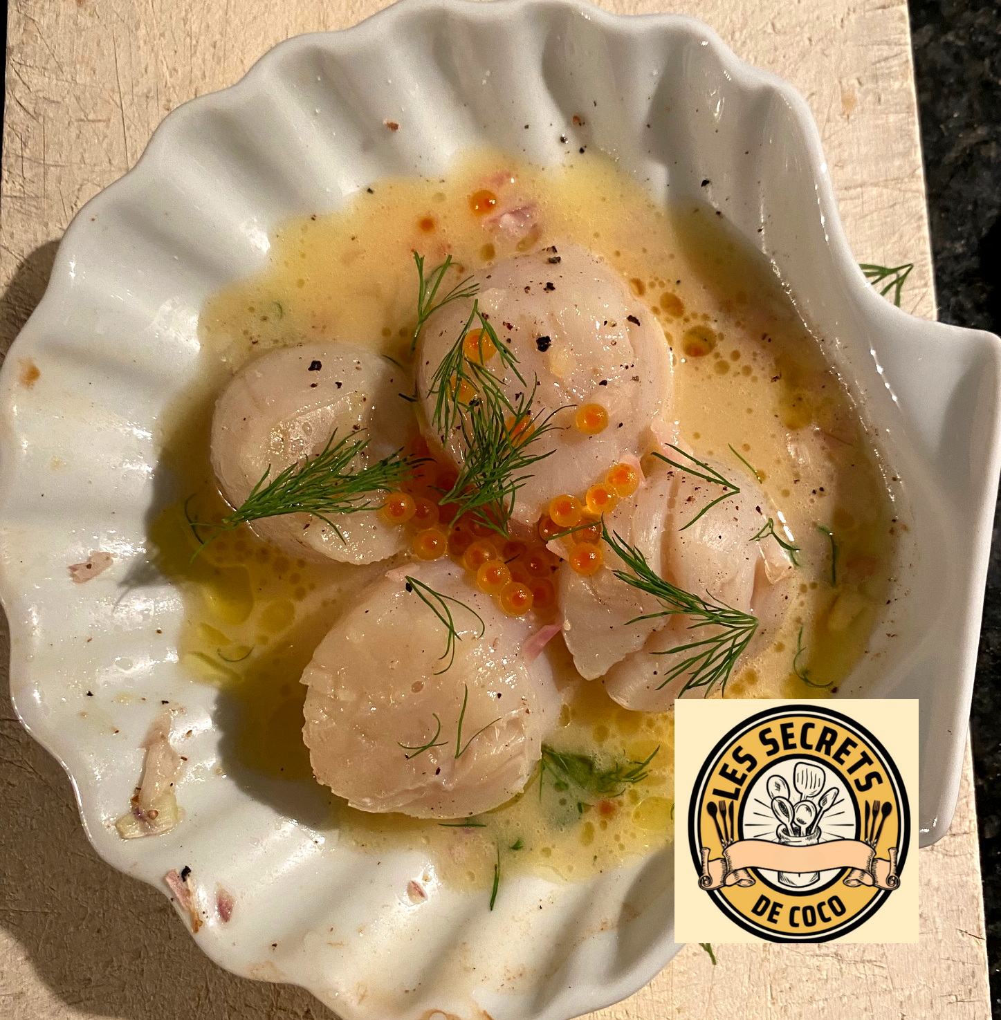 Pour 4 personnes : 2 échalotes (a ciseler finement) 12 noix de st jacques, 60 grammes de beurre, 4 CS de vin blanc, 1/2 citron (à presser pour le jus) 50 grammes d'œufs de saumon, de l'aneth