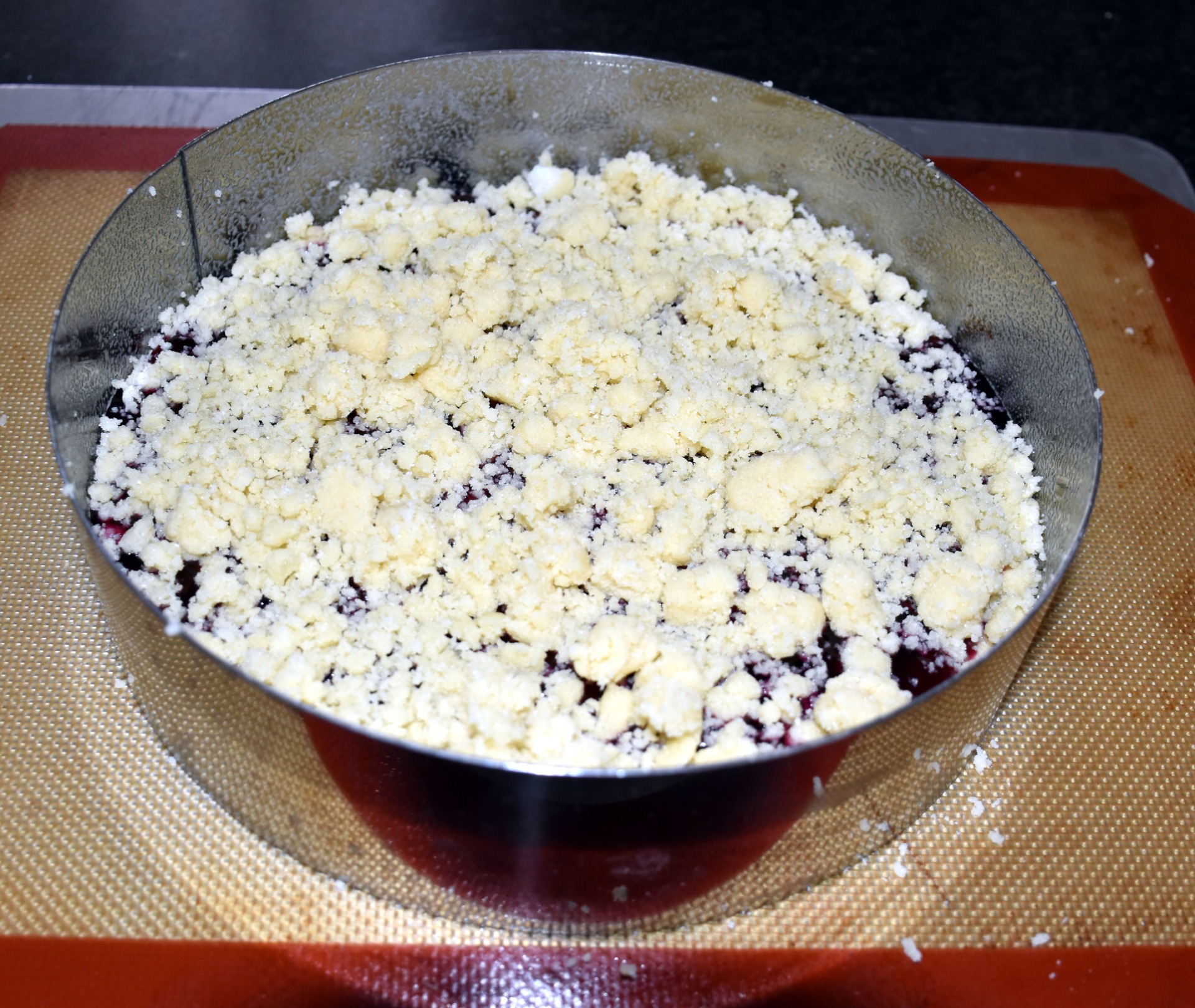 Déposez la première partie dans un cercle de 18/20cm beurré (ou un moule tapissé de papier sulfurisé), tassez légèrement, puis recouvrez de confiture. Émiettez le reste de la pâte sur le dessus.
