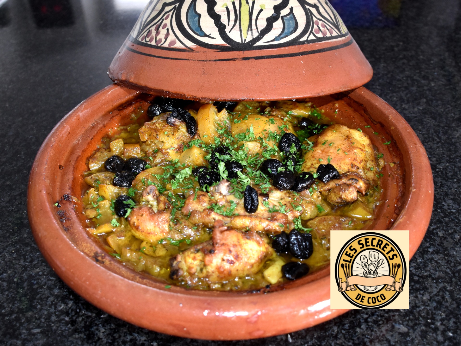1 poulet coupé en morceaux - 2 citrons confits - 10 Cs d'huile d'olive - 1 Cs de cumin - 1 CS de curcuma - 1 gramme de gingembre - 1 Gramme de cannelle - 4 gousses d'ail - 1 bouquet de persil - 1 bouquet de coriandre - 1 oignon - 100 grammes d'olives noires - sel - poivre